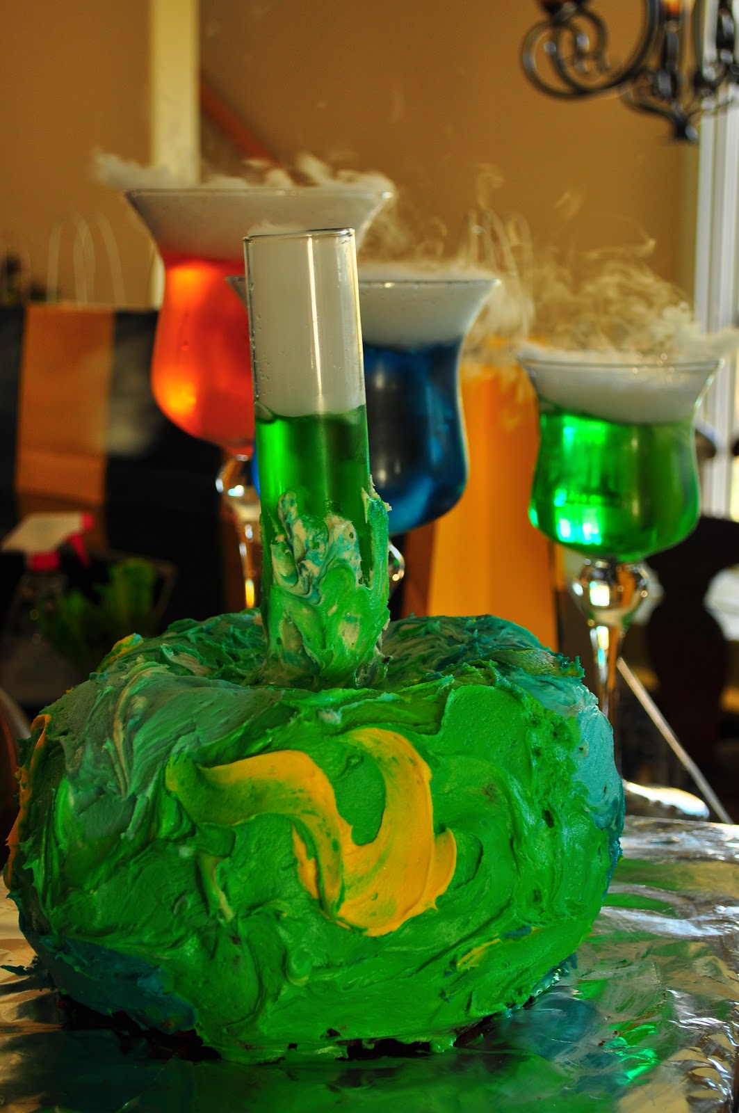 Here's Jennifer's cake, cleverly disguised as a smoking beaker of green gloop! It was choclate, just in case you're wondering.